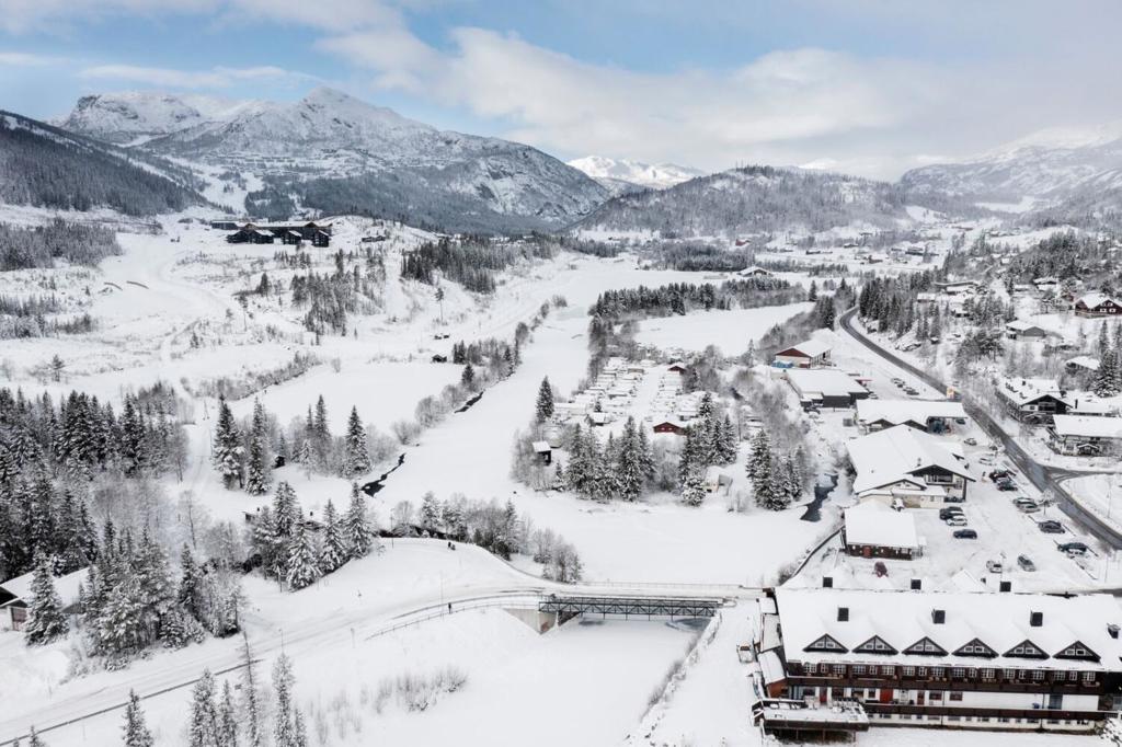 Utbyggingsområdet ligg nedanfor dei mørke bygningane på Fýri Hotell, oppe t.v. i biletet. Foto: Elias Dahlen (Hallingølen)