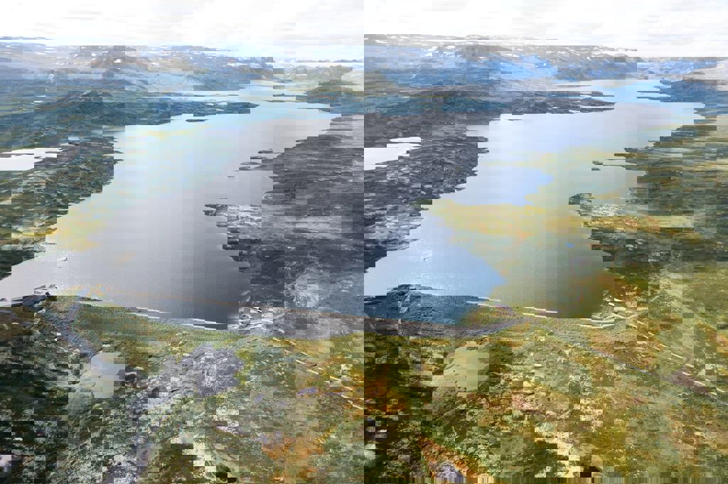 Foto: Fra Facebook siden til gruppen "Ombygging Dam Flævatn". Bildet over viser reguleringsmagasinet på Flævatn som forsyner kraftstasjonen Hemsil-1 nede ved Hydnefossen med vann gjennom en tunnel i fjellet. Hemsil-1 produserer det meste av strømmen som forbrukes i Hemsedal.